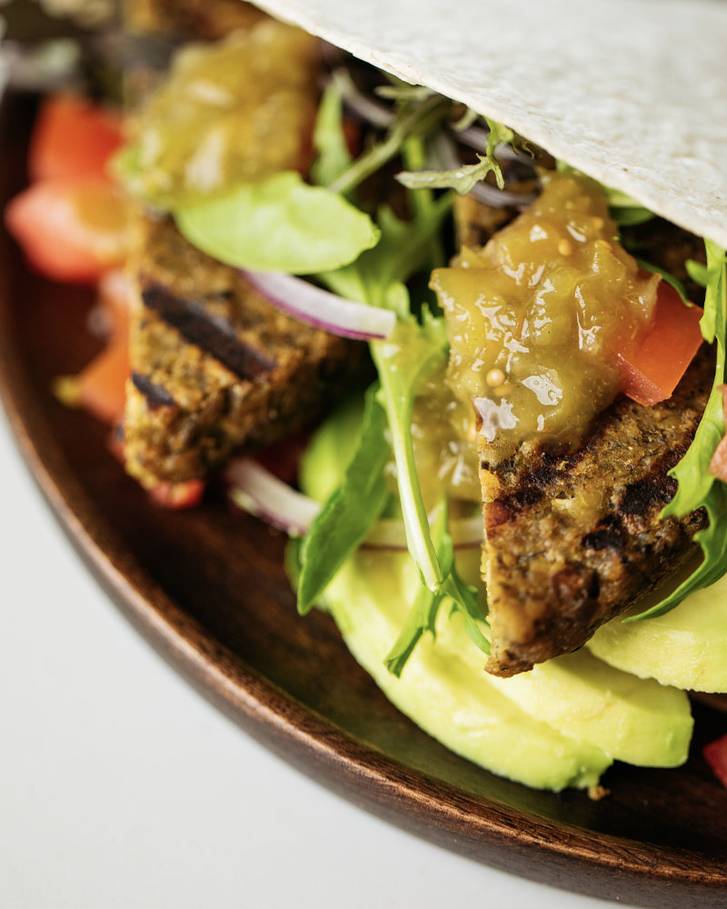 - Remove from the heat and layer the wrap with fresh rocket leaves, baby spinach, chopped red onion, chopped red capsicum and sliced avo.